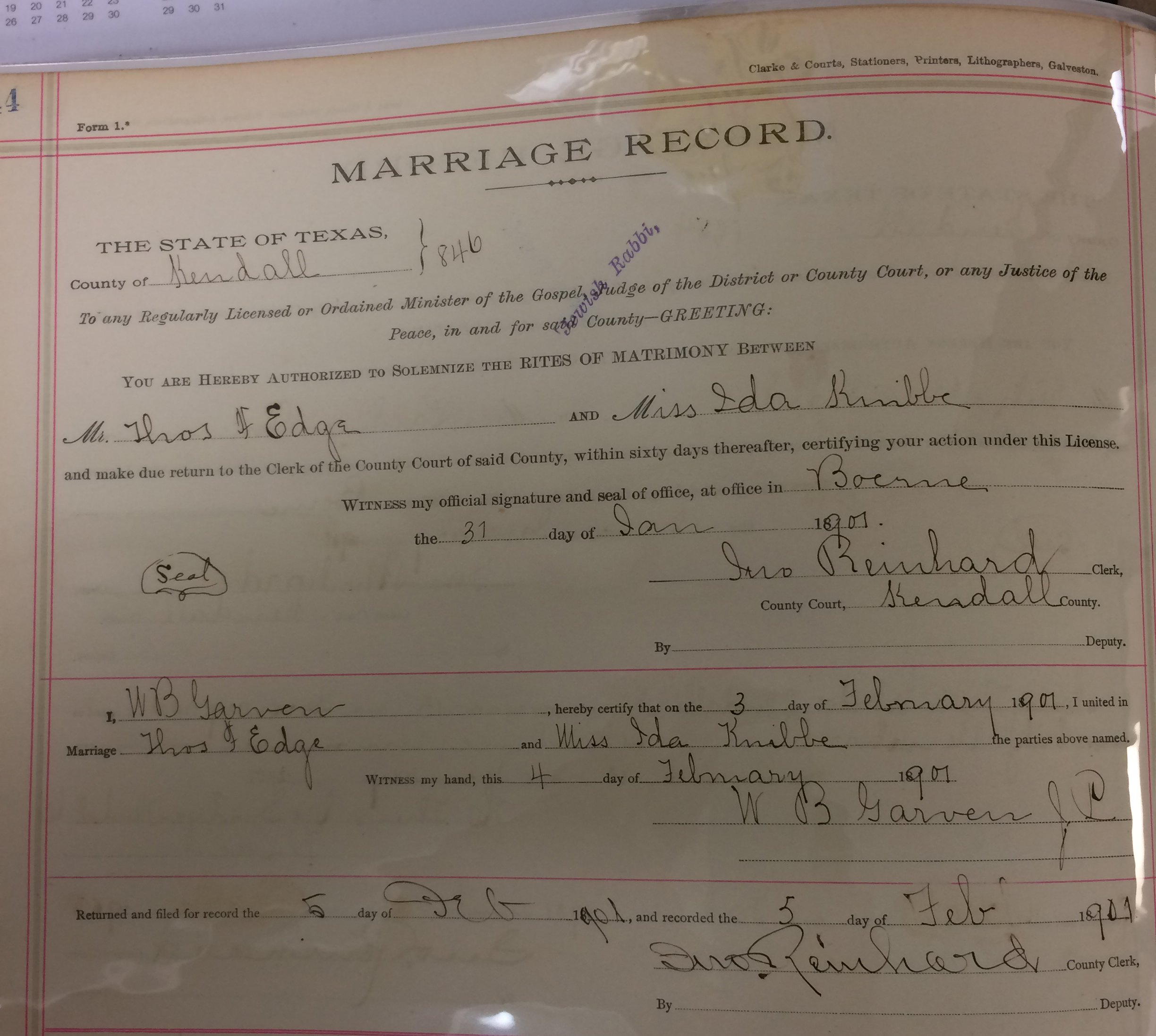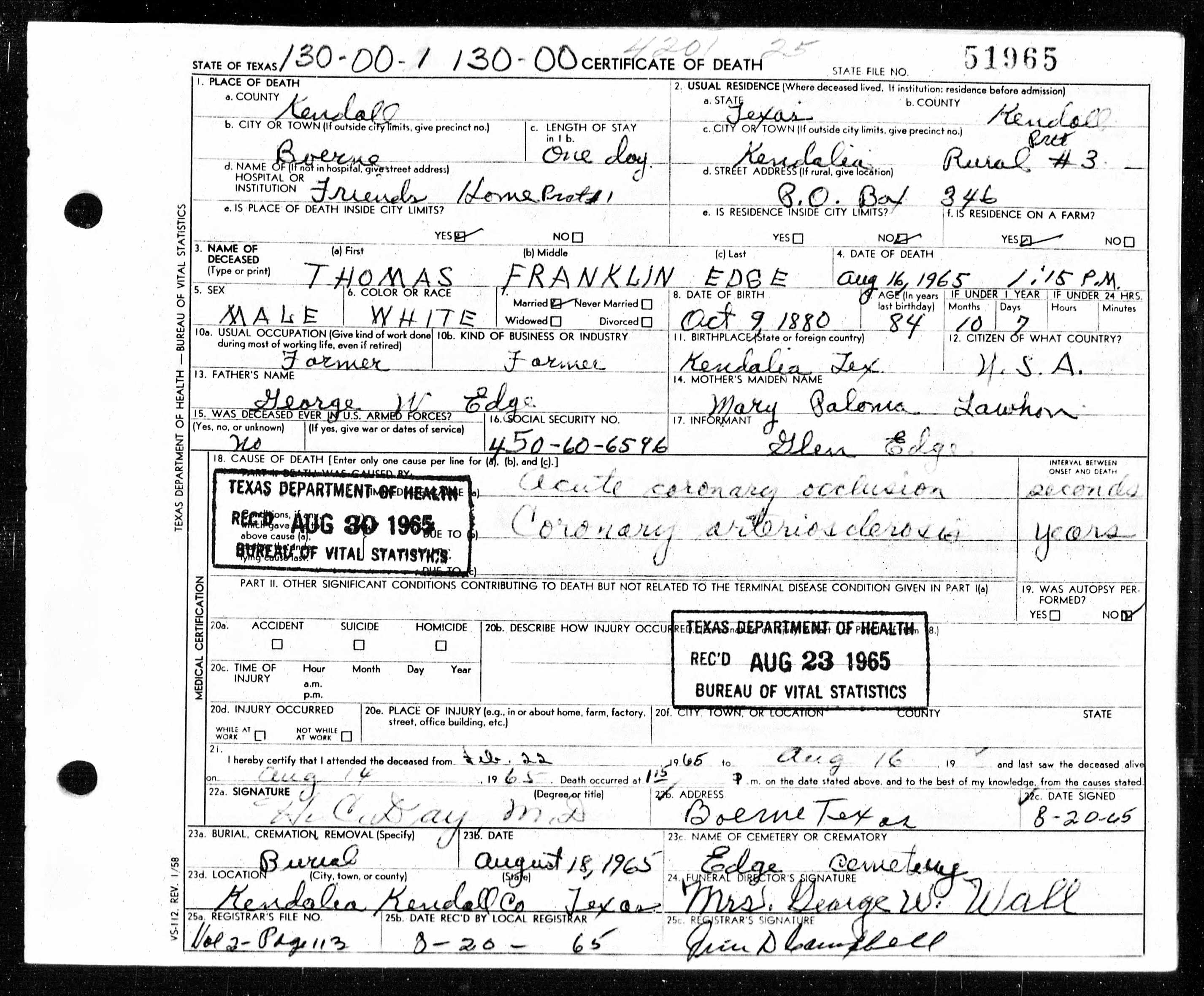 Thomas Franklin Edge was born 9 Oct 1880 in the Curry Creek Community, Kendall, Texas and died 16 Aug 1965 in Boerne, Kendall, Texas. He was the son of George W Edge and Mary Paloma Lawhon Edge.