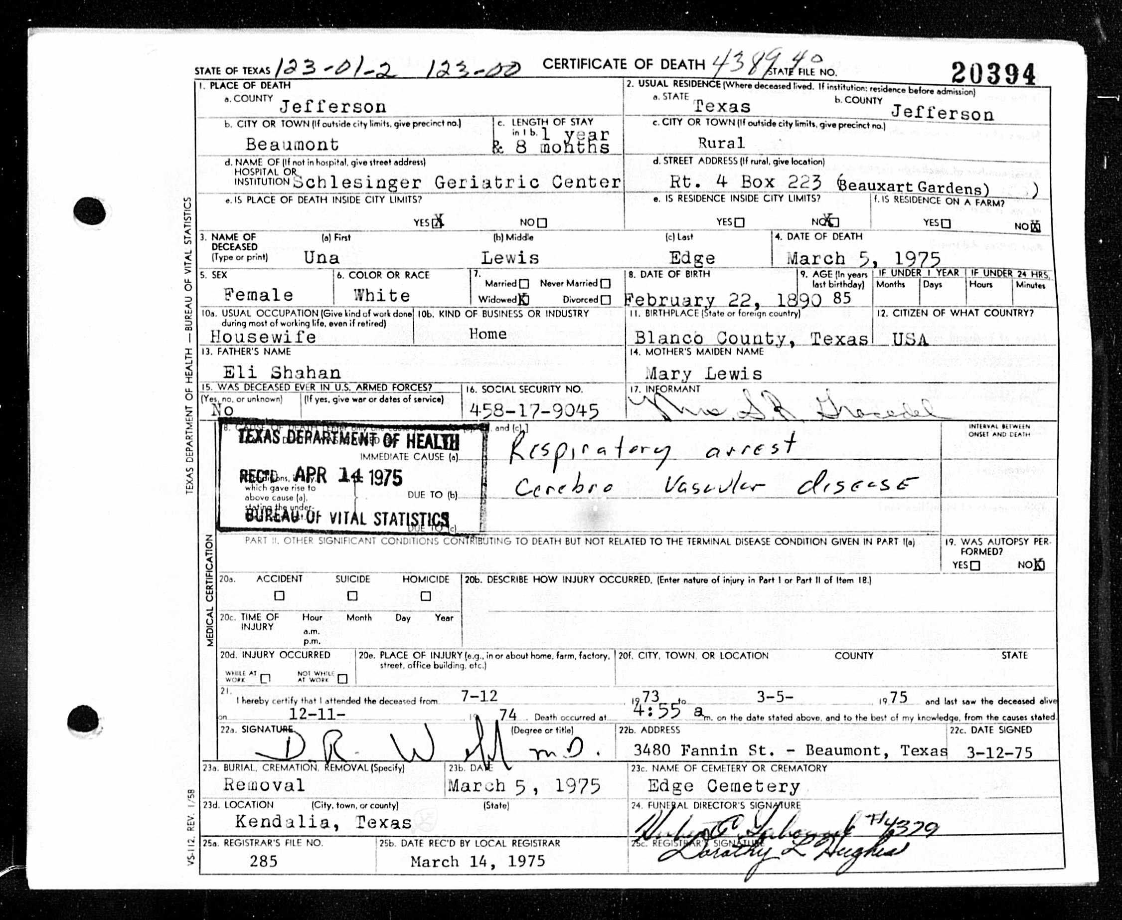 Una Lewis was born 22 Feb 1890 in Blanco, Texas and died 5 Mar 1975 in Beaumont, Jefferson, Texas. She was the daughter of Elry Daran Shahan and Mary Ellen Lewis.