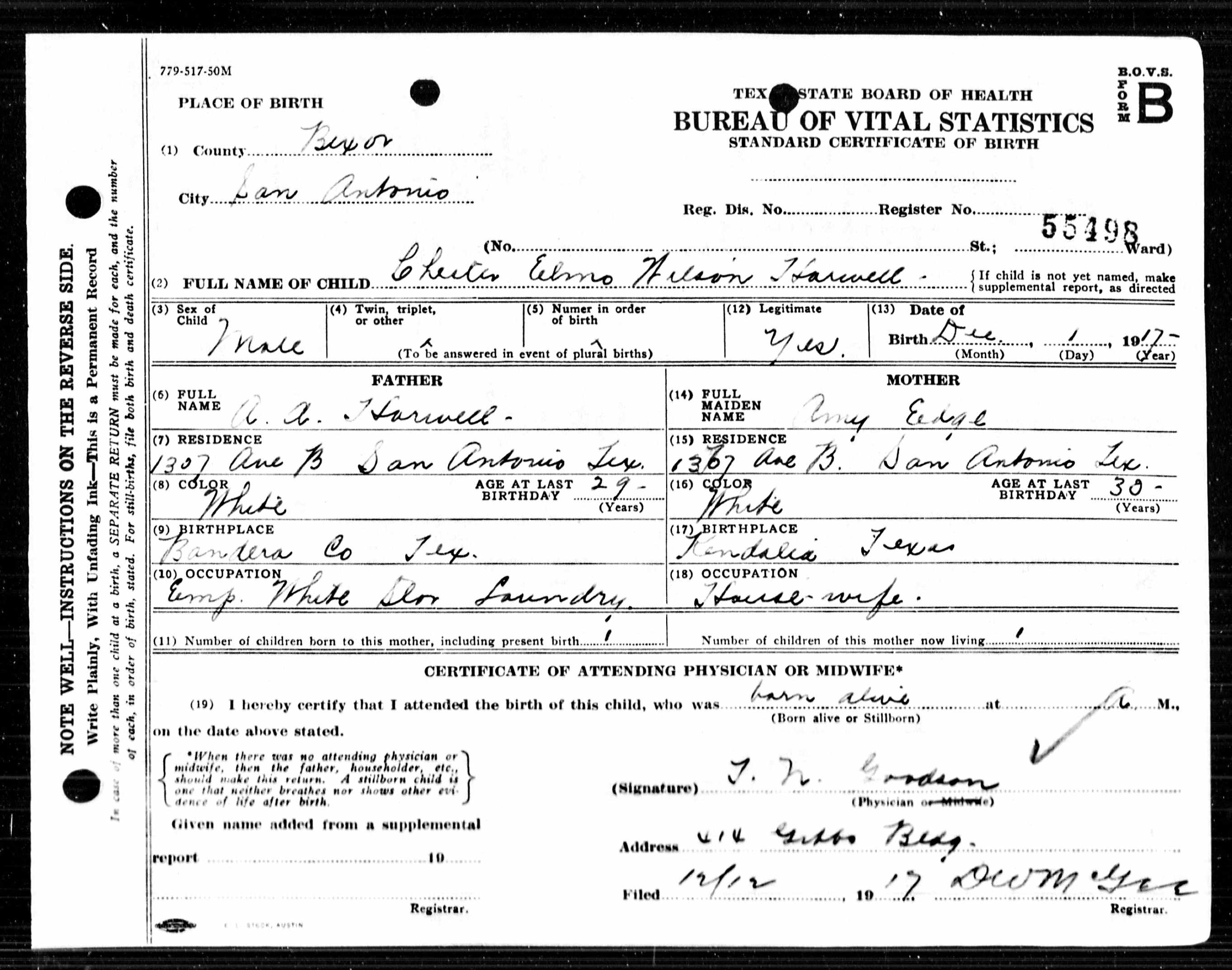 Chester Wilson Harwell was born in San Antonio, Bexar, Texas on 28 Nov 1917 and died near Kendalia, Kendall, Texas on 4 Jul 1964. He was the son of Ambrose Andrew Harwell and Amy Emily Edge Harwell.