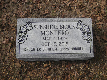 Sunshine Brook Harwell was born in at Edge Falls near Kendalia, Kendall, Texas on 1 Mar 1979 and died in Blanco County, Texas on 15 Oct 2019. She was the daughter of Harold Andrew "Hal" Harwell, Jr and Kerry Newbold Harwell.