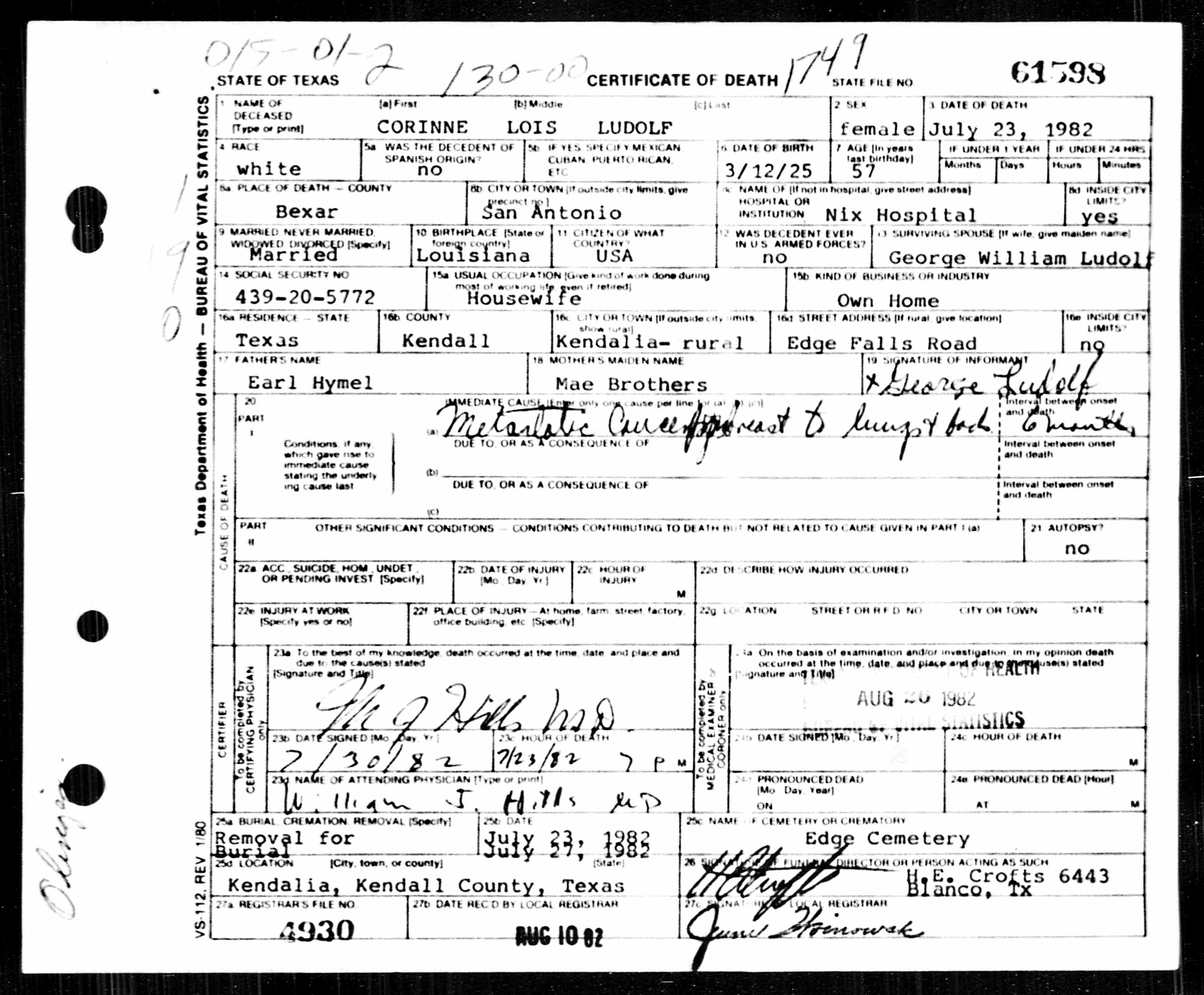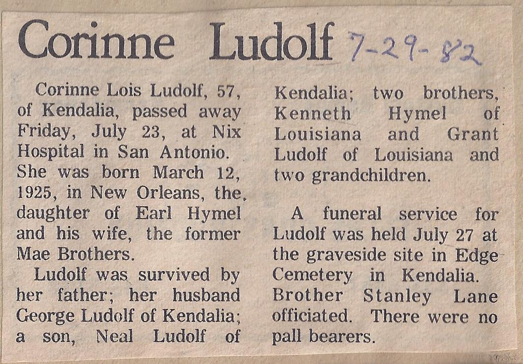 Corinne Lois Hymel was born 12 Mar 1925 in New Orleans, Louisiana and died 23 Jul 1982 in San Antonio, Bexar, Texas.