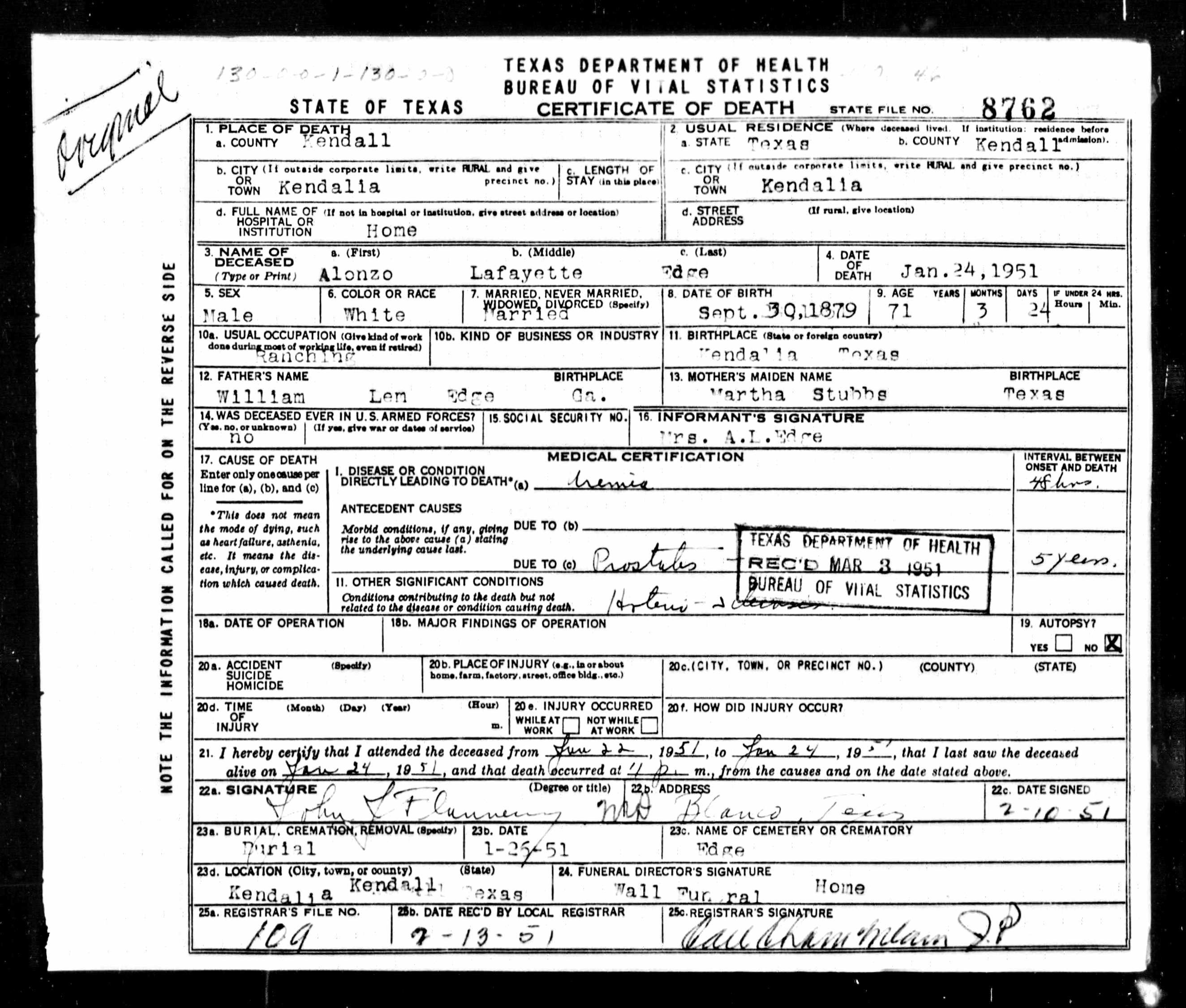 Alonzo Lafayette Edge was born on 30 Sep 1879 in the Curry Creek Community, Kendall, Texas and died 24 Jan 1951 near Kendalia, Kendall, Texas.  He was the son of William T Edge and Martha Beth "Mattie" Stubbs Edge.