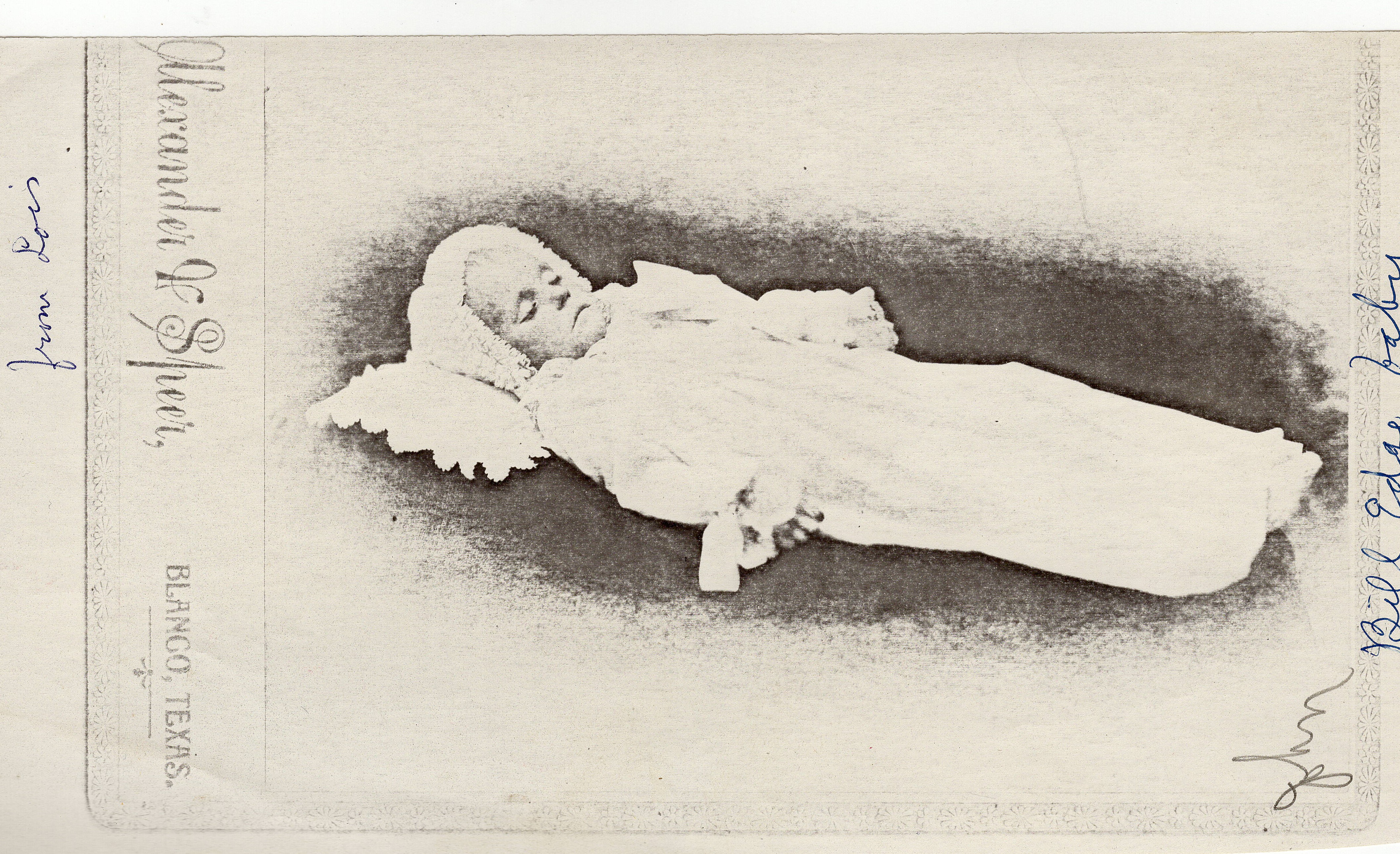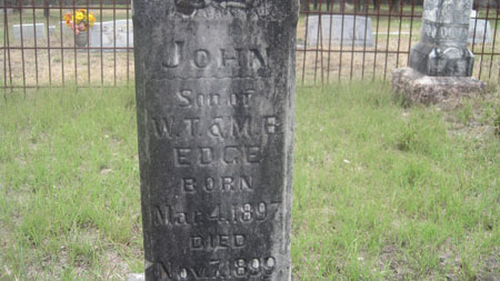 John Edge was born on 4 Mar 1897 near Kendalia, Kendall, Texas and died 7 Nov 1899 near Kendalia, Kendall, Texas.  He was the son of William T Edge and Martha Beth "Mattie" Stubbs Edge.
