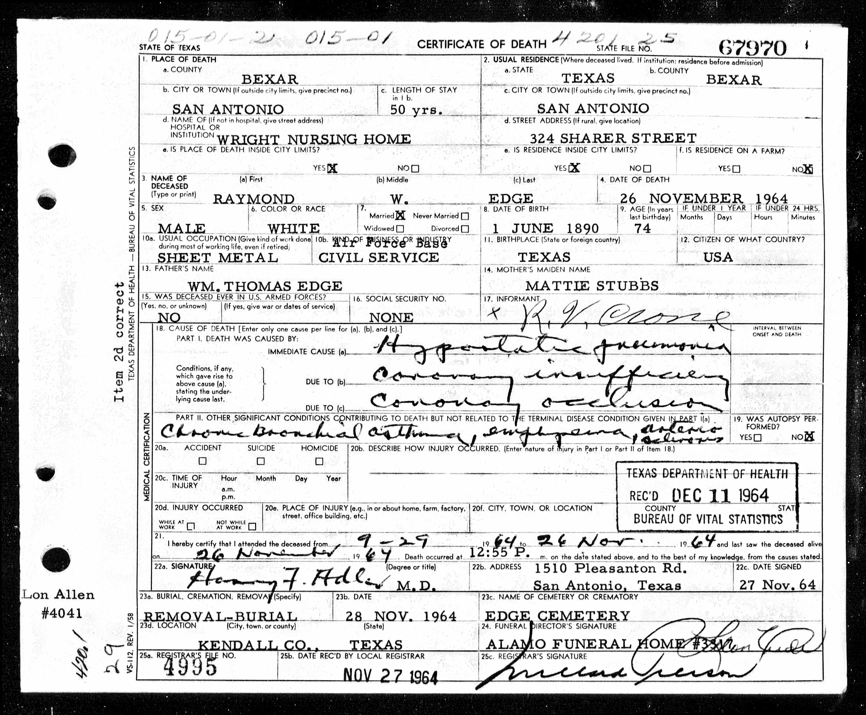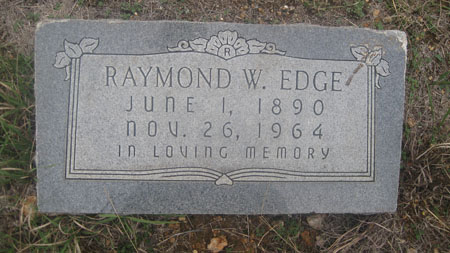 Raymond William Edge was born on 1 Jun 1890 near Kendalia, Kendall, Texas and died 26 Nov 1964 in San Antonio, Bexar, Texas. He was the son of William T Edge and Martha Beth "Mattie" Stubbs Edge.
