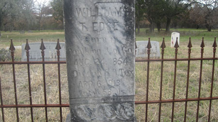 William Thomas Edge was born in Paulding County, Georgia on 24 Aug 1854 and died in San Antonio, Bexar, Texas on 6 Apr 1913. He was the son of William B Edge and Josaphine Catherine Carter Edge.