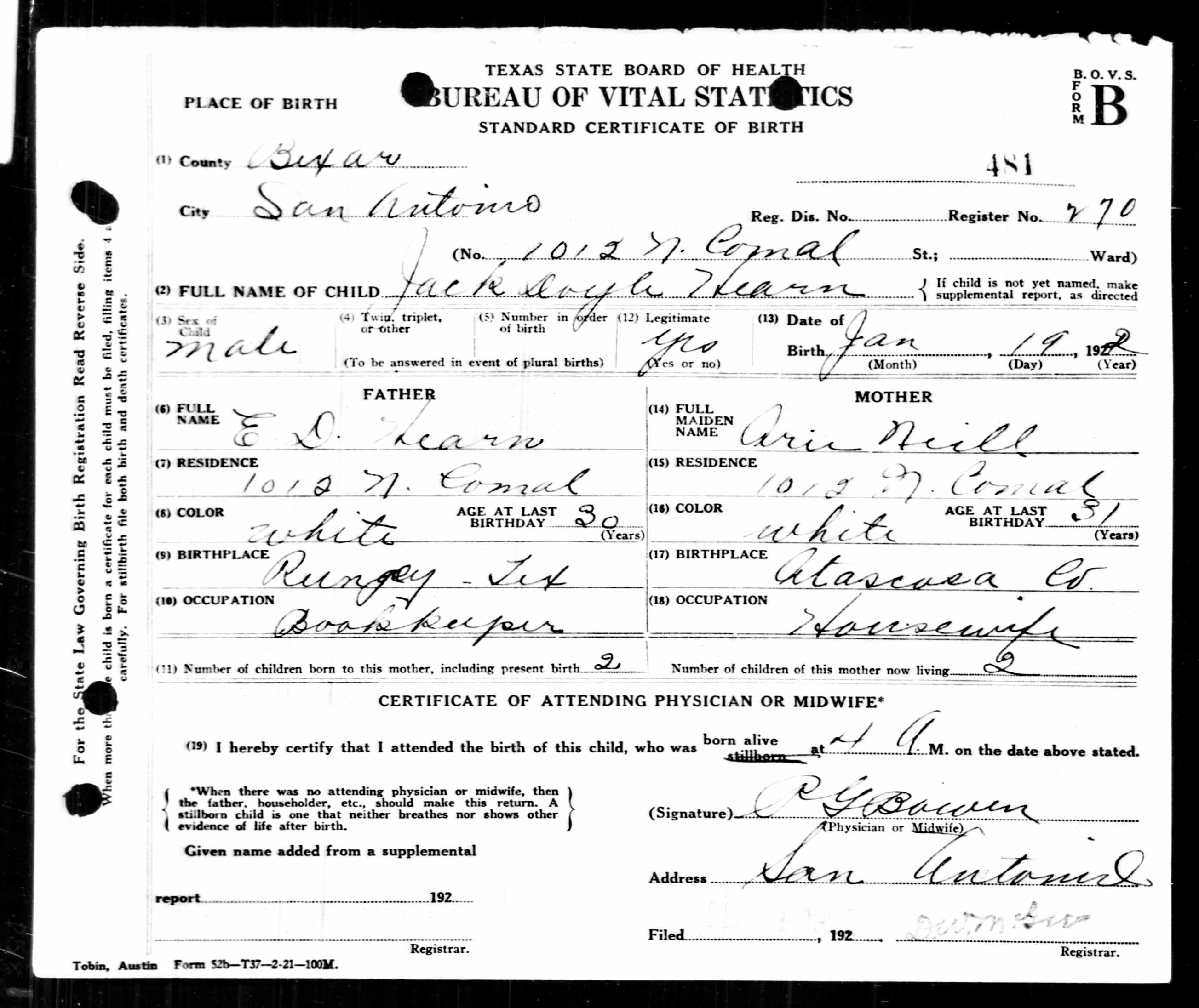 Jack Doyle Hearn was born on 19 Jan 1922 in San Antonio, Bexar, Texas and died on 26 Jan 2017. He was the son of Eulen Doyle Hearn and Arie Mills Neill Hearn.