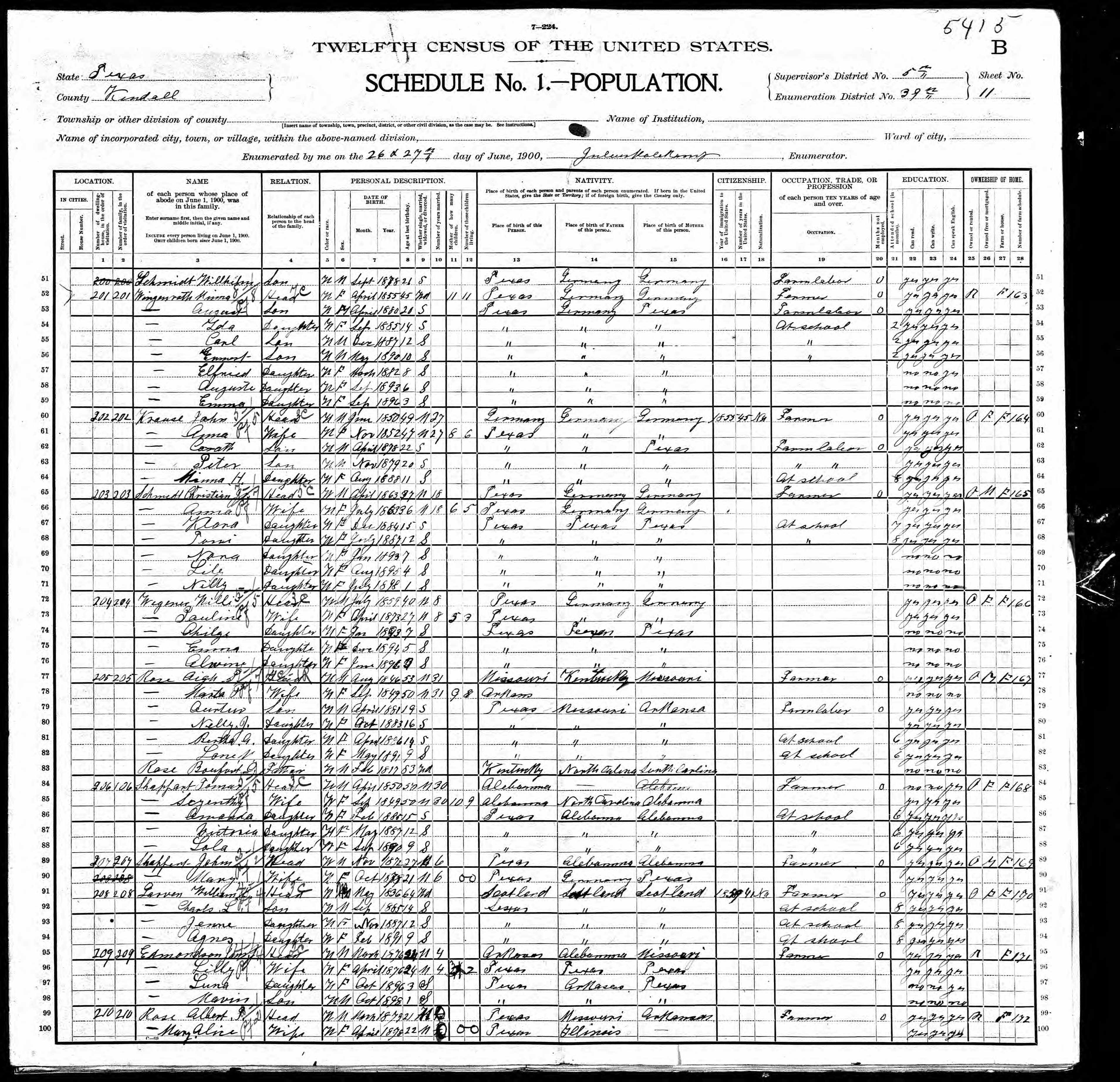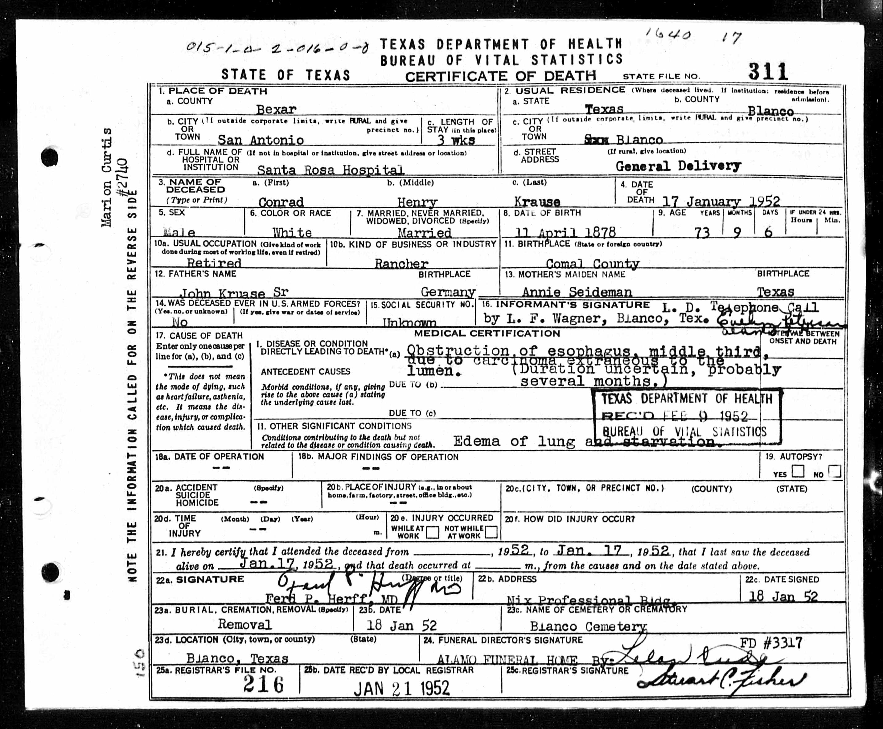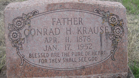 Conrad Henry Krause was born 11 Apr 1878 near Anhalt, Comal, Texas and died 17 Jan 1952 near Kendalia, Kendall, Texas. He was the son of John Krause and Anna Seidemann Krause.