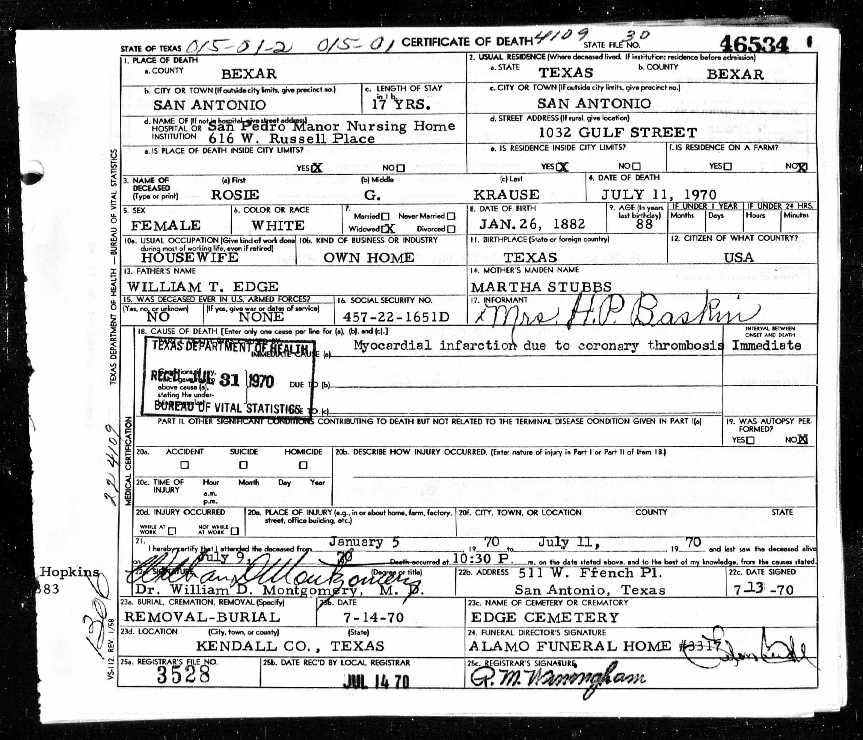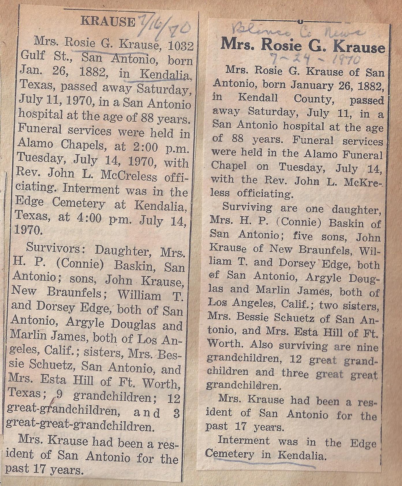 Rosie Gertrude Edge was born 26 Jan 1882 near Kendalia, Kendall, Texas and died 11 Jul 1970 in San Antonio, Bexar, Texas. She was the daughter of William T Edge and Martha Beth Stubbs Edge.