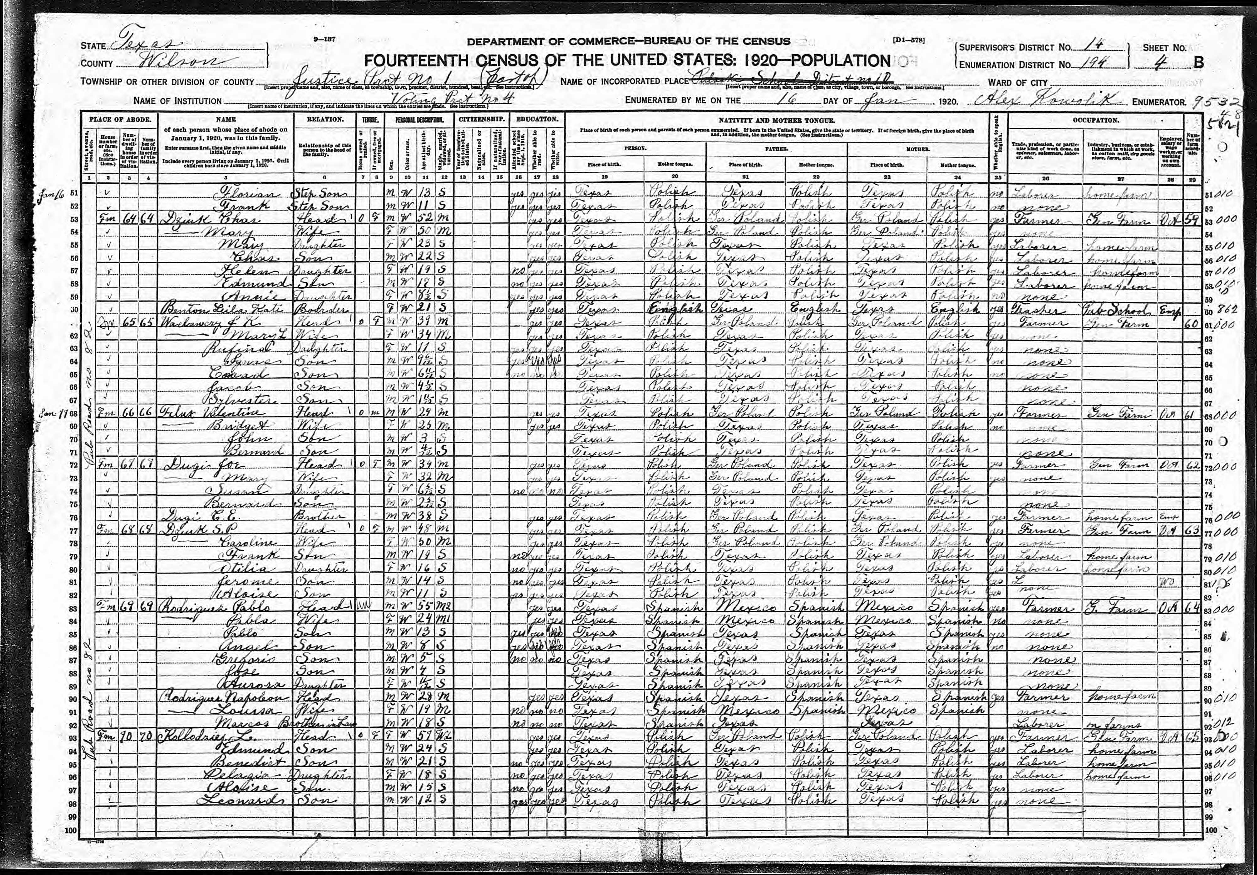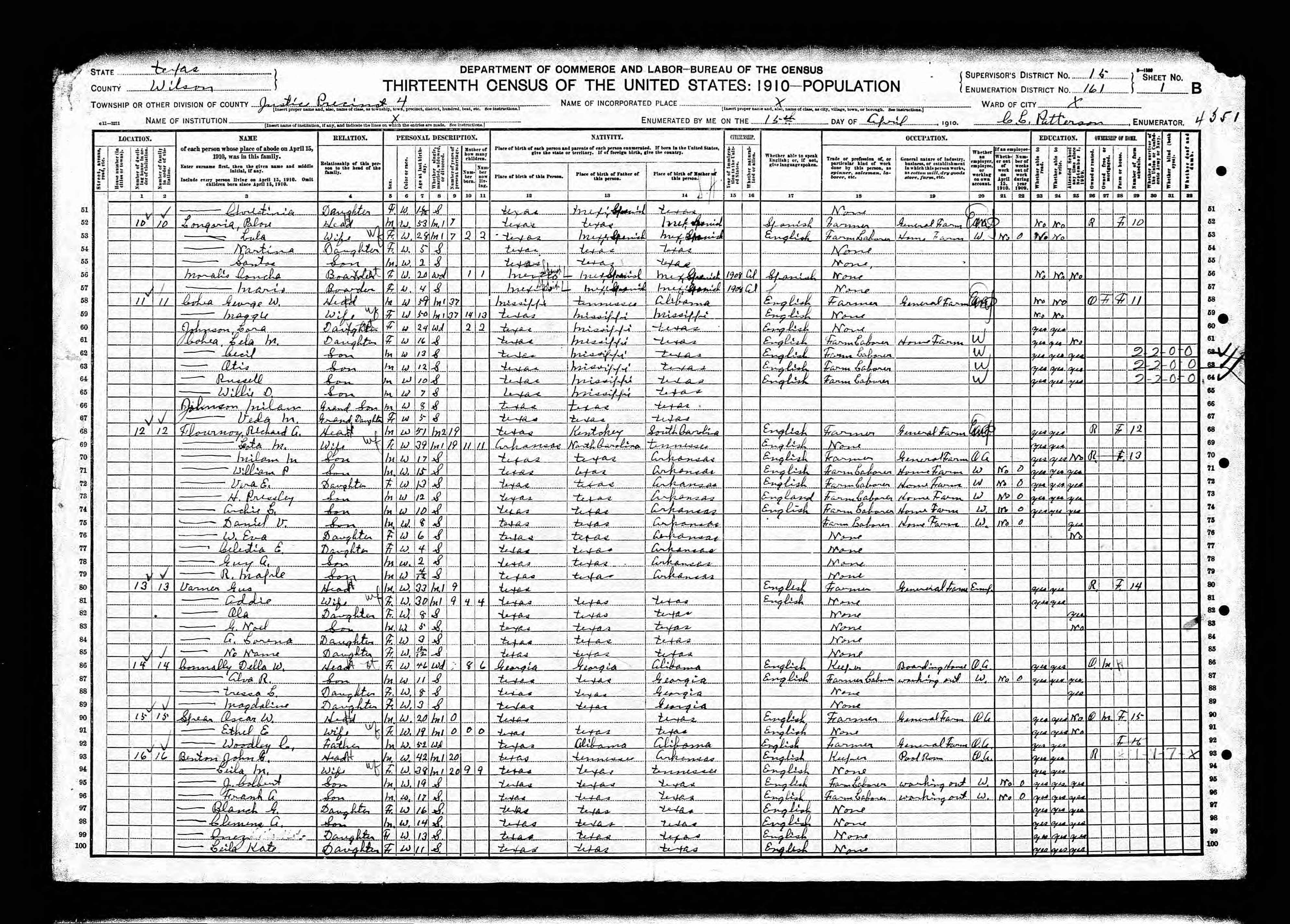 Leila Kate Benton was born in Wilson County, Texas on 30 Nov 1898 and died in San Antonio, Bexar, Texas on 19 Jul 1970. She was the daughter of John Benton and Malissa Leila Hodges Benton.